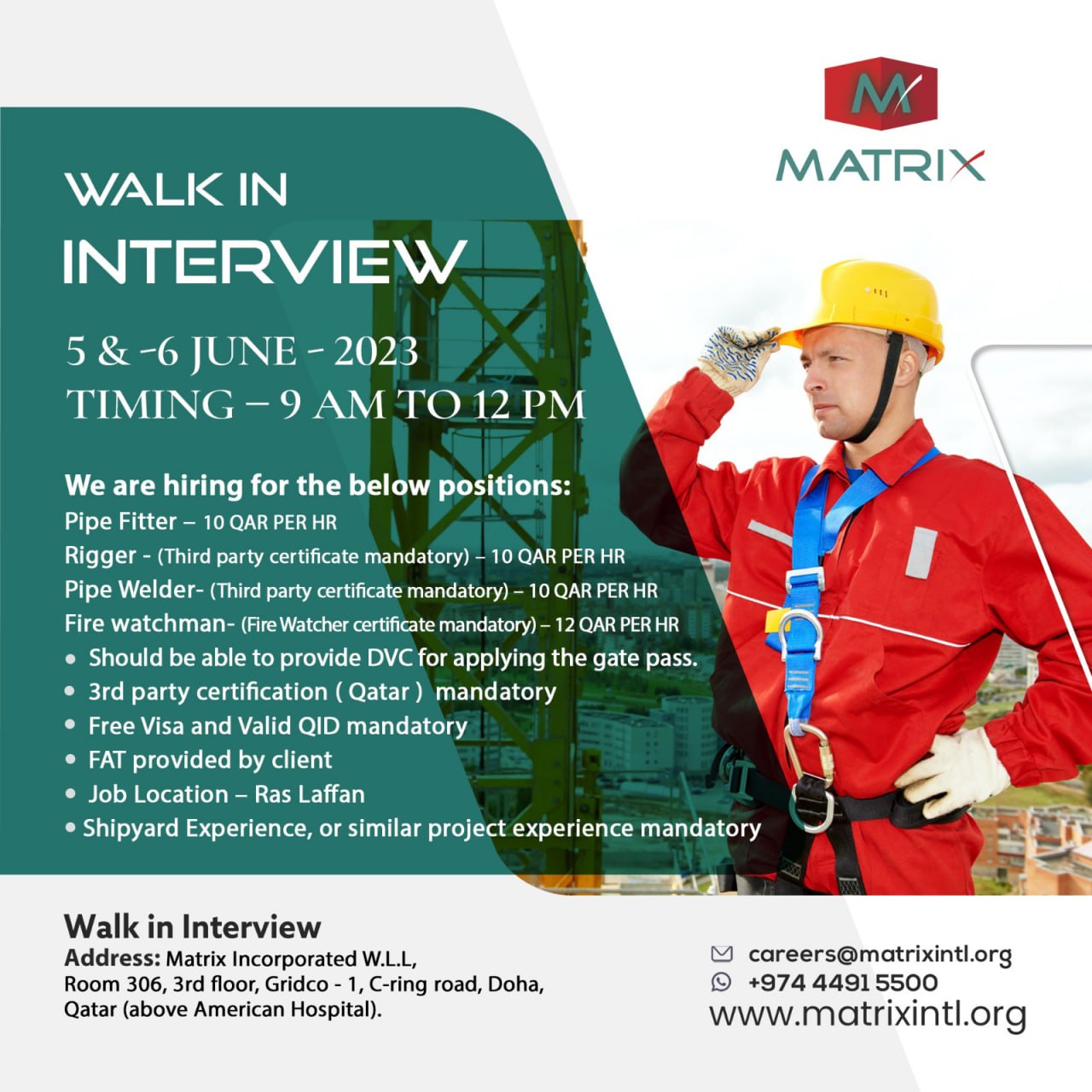 Or Visit office on 5th june 2023 Address: Matrix Incorporated W.L.L, Room 306, 3rd floor, Gridco - 1, C-ring road, Doha, Qatar (above American Hospital).